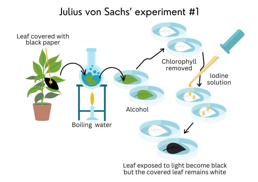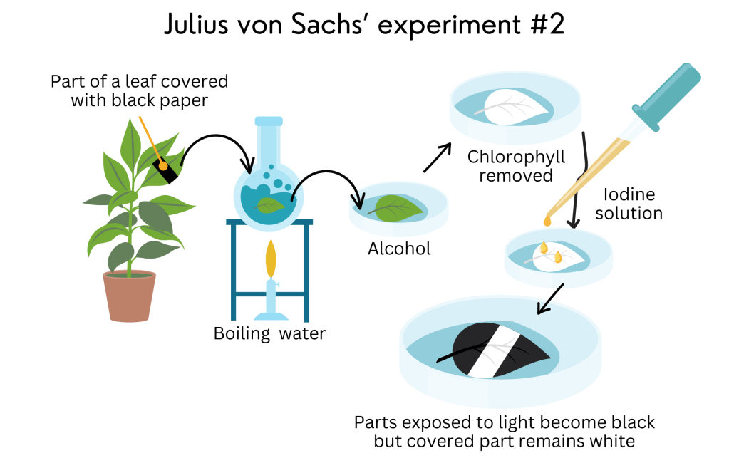 In 1854, he performed an experiment where he covered one of the leaves of a plant for twelve hours using a dark piece of paper. Then, he took off this leaf and another one that remained uncovered under sunlight. He put the two leaves into boiling water and then into alcohol. The leaves turned white because the alcohol removed all their chlorophyll. He then added a few drops of iodine solution over both leaves. The leaf that received sunlight became stained black, but the covered leaf remained colourless.