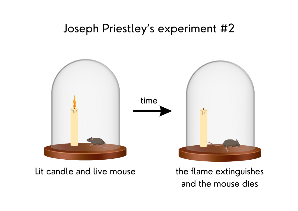 In the first one, he placed a burning candle under a dome and observed that soon the flame was extinguished. In the second, he put a mouse under the dome where the candle had burned and found that the mouse did not survive. In the third experiment, he placed a mint plant under the same dome as a burning candle, and in another dome, he put a mint plant, a burning candle, and a mouse. The mint plants in both domes kept the candles burning and the mouse alive. He concluded that the mint renewed the air inside the domes, chemically removing the “phlogiston.” At that time, he did not know that plants produce oxygen, necessary to both make the candle burn and keep the mouse alive. He thought that only the plant growth was responsible for that and did not account for the need for sunlight.