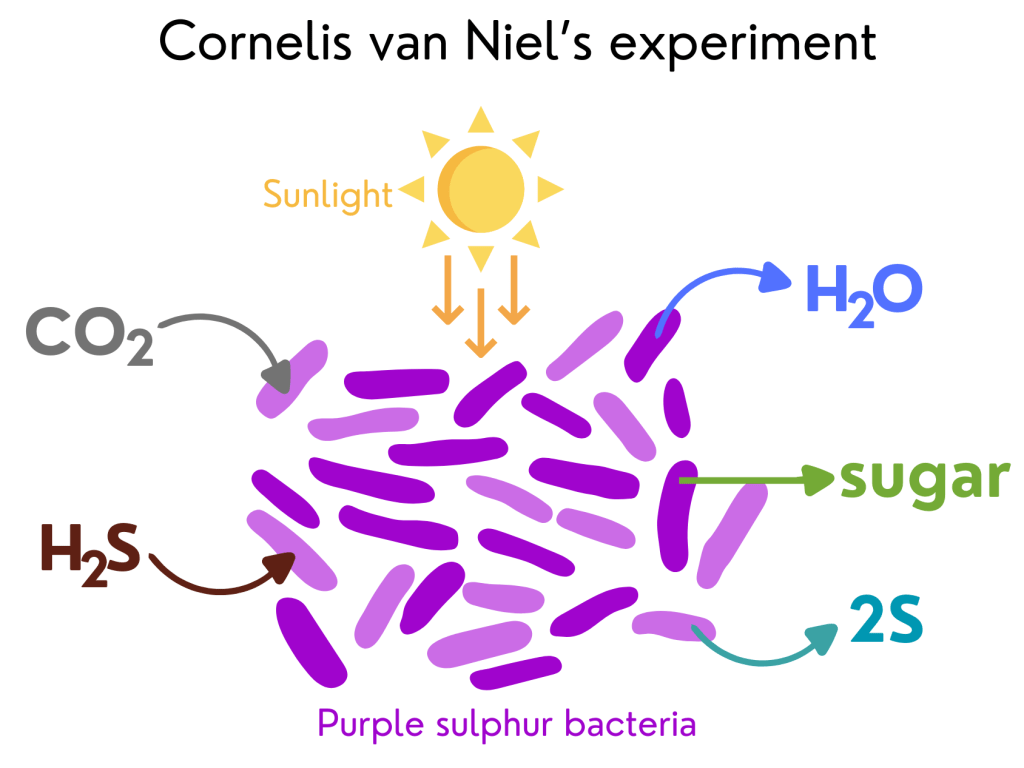 Cornelis van Niel, a Dutch-American microbiologist (a scientist who studies microscopic organisms such as bacteria), was the first one to question this idea. In 1931, he was studying purple sulphur bacteria, microscopic organisms that also undergo photosynthesis, but they use hydrogen sulphide (H2S – a colourless, flammable, and extremely dangerous gas with a “rotten egg” smell) instead of water and do not release oxygen. Photosynthesis for these bacteria has the following chemical equation*: CO2 + 2H2S –> (CH2O) + H2O +2S.