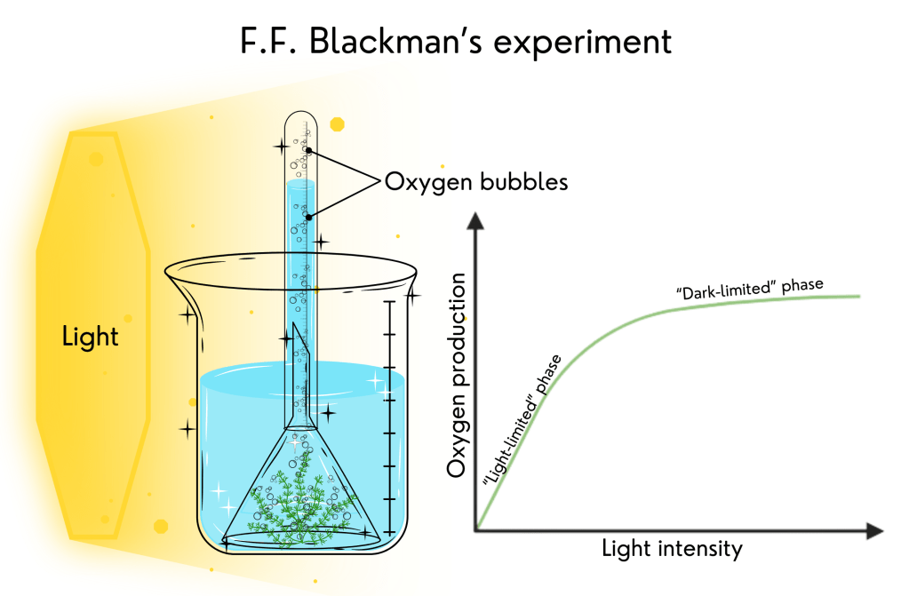 Frederick Frost Blackman, a British plant physiologist, was the scientist who provided us with some of these answers. In 1905, he performed an experiment using an aquatic plant called Elodea. He placed this plant in a beaker with a water solution of baking soda as a source of CO2, covered the plant with a funnel, and covered the funnel with a test tube. When the plant received light, it immediately started to release oxygen bubbles. He then exposed this plant to different light intensities, counting the number of bubbles released during a fixed interval of time at each of the many light intensities and took notes of the results to make a graph.